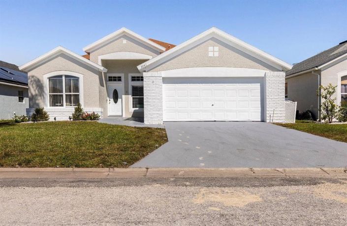MOTIVATED OWNER - FULLY FURNISHED Welcome to this beautifully updated 4-bedroom, 2-bath pool home in the desirable Fairways Lake Estates community! This single-story residence features an open layout, a bright kitchen with pantry, tile flooring throughout, and a spacious primary suite with a walk-in closet and updated bath. The fully fenced backyard offers a private retreat with a screened-in heated pool and built-in outdoor grill, perfect for relaxing or entertaining. The garage has been creatively converted into a fun recreation space with a bar area. Energy-efficient solar panels help keep utility costs low, and the low HOA fee includes access to fantastic amenities such as a community pool, tennis and basketball courts, playground, and a fishing pier with lake access. Ideally located near Disney, shopping, dining, golf, and major highways.This home is perfect as a primary residence, vacation getaway, or investment opportunity. Solar panels: new owner must take over the contract. House can also be used as a short-term rental. Roof 2016, AC 2017, Pool Pump 2019, Pool Heater 2024.