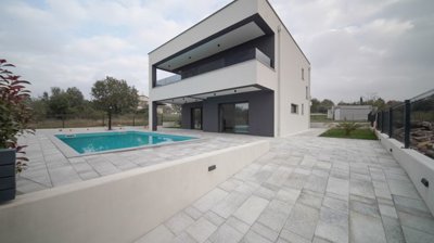 Buje – modern newly built house with sea view, 6,500 meters from the coastIn the peaceful Istrian village of Kaštel, just a few minutes from Buje and close to the Slovenian border, a modern newly built house is for sale. This property combines high-quality construction, elegant design, and full comfort for everyday living. It offers everything today’s buyers seek: spaciousness, functionality, privacy, and top-tier quality.The house features 150 m² of thoughtfully designed living space, ensuring every corner is maximized for comfort and utility. It includes four bedrooms, each with its own private bathroom, providing hotel-level luxury and complete privacy for family members or guests. Additionally, the property includes a separate guest toilet and a fully independent laundry/utility room, enhancing daily convenience and organization.Large glass walls bring in abundant natural light and open up to views of the sea and surrounding greenery, connecting the open-plan living room and kitchen with the outdoors. Modern systems such as underfloor heating, electric shutters, and integrated mosquito screens ensure comfort throughout the year.The 550 m² land plot includes a swimming pool and ample space for a summer kitchen or other outdoor amenities according to the owner’s preferences.