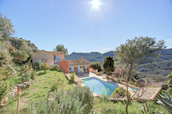 On foot in the village, traditional villa built in 1995, in a dominant position, offering a superb view of the surrounding hills, on a terraced plot of 1800m2, naturally wooded and embellished with a heated free-form swimming pool.
