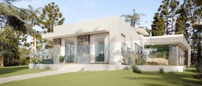 The bungalow features the same open plan layout spanning a single floor. There are 3 bedrooms with 1 bigger bedroom en-suite, two smaller ones for the kids. The biggest room is the combined kitchen-living room, approx. of 50 sq. m. The kitchen boasts an island and a space for a big table for 8 (not included). The living area will have enough space for two sofas and a huge TV (both not included). Both areas have windows all around, including a cooking area.