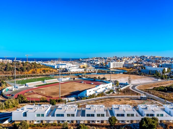 New modern three-bedroom villa with swimming pool in Lagos, where the entrance unfolds gracefully into a captivating backyard, guiding you to the main entrance and a conveniently designed garage for two cars. To your right, a swimming pool adorned with glazed ceramic tiles, embraced by a waterproof deck, awaits, along with an additional pre-equipped space for a contemporary gas grill, complemented by a worktop sink in Dektone, creating an inviting ambience.