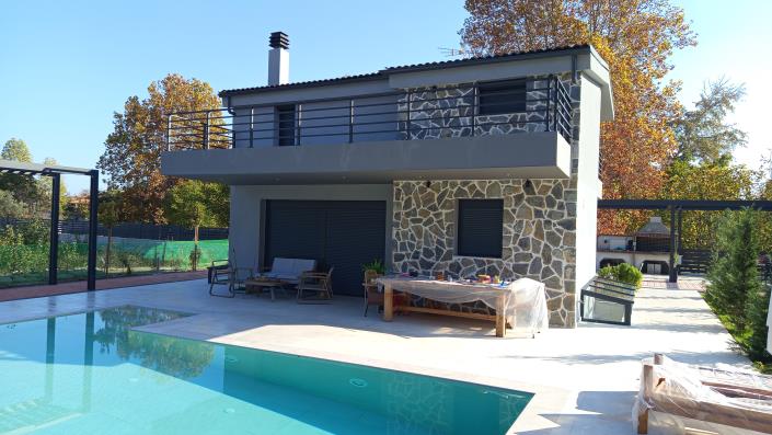 This private pool villa is located in a small, low-density residential street with limited traffic and surrounding greenery, in the wider Platamonas area, in Pieria Greece, within approximately five minutes’ walk from the beach.