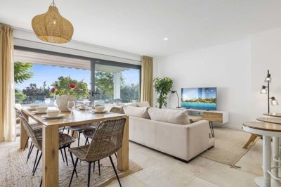 The apartment features a bright open-plan living and dining area that flows seamlessly onto a large private terrace and garden, creating an ideal space for both relaxation and entertaining. The fully equipped kitchen is fitted with top-quality appliances, while all three bedrooms offer generous space and direct garden access. The master suite includes an elegant en-suite bathroom.
