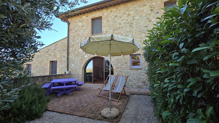 In the countryside outside Volterra only 4.5km from the Etruscan town and its services, offer this 2 bedroom 2 bathroom part of completely refurbished farmhouse with private garden set in a complex with shared swimming pool in a fantastic panoramic location, just over the hour from Pusa airport and less from the coast. The complex comprises 11 apartments, is easily reachable through a 1.5 km of unpaved road in perfect condition is accessible through an automatic gate which opens onto a spacious parking area; from the parking a pathway leads to each house and the communal swimming pool. The apartment for sale develops over three floors for a total of about 150m2 (112m2 net floor area) and it boasts a 125m2 private garden. The ground floor, accessible through a huge arched French door consists of an open plan living/dining-room, kitchen and bathroom with shower. Internal stairs lead to the basement where it is possible to find the laundry and the storage room. The first floor comprises 2 wide bedrooms and bathroom with shower. All renovations have been done to an extremely high quality and according to the typical Tuscan style with amazing handmade terracotta floors, impressive beamed ceilings and exposed stones and bricks on the outdoor walls. The big windows and the high ceilings provide natural light to the rooms. The house is well-exposed as it faces West and it is possible to admire unforgettable sunsets. All utilities are connected with mains water, mains electricity and LPG heating. Each property in the complex benefits from 2 car-spaces and use of the amazing (salt-water system) 16 x 8 m swimming pool with travertine solarium where it is possible to admire a breathtaking 360° panoramic view across the surrounding hills with the lights at night over Volterra being superb. This house is perfect not only as second home but also as permanent residence thanks to its wide spaces and its closeness to the amenities. High rental potential.