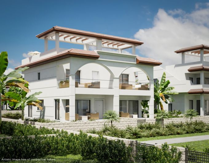 Penthouses for sale in a new complex in Quesada.We offer for sale penthouses near Ciudad Quesada, in a quiet area, only 10 minutes driving from the beautiful sandy beaches of Guardamar del Segura.The apartments are located in a new build development with a very unique and recognizable style. It is an atrium-style architecture, with all the two storey buildings located around the long communal pool, which means each apartment has a beautiful view from its upper private solarium or a garden. The interior of the apartments is composed of 89 square meters distributed in 2 bedrooms, 2 bathrooms, light airy salon with a modern integrated kitchen, outdoor terrace and a huge solarium. Also each apartment has a storage.Ciudad Quesada offers a huge choice of bars and restaurants, shops and supermarkets, Luxury spa hotel, an 18 hole golf course with driving range and even an aquapark! All this is just 10 minutes from some of the best Blue flag beaches on the Costa Blanca. Both Alicante and Murcia airports are within 30 minutes drive approx 38 km.