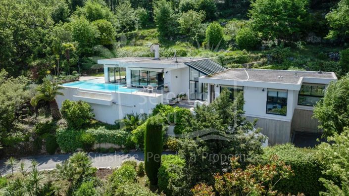 Nestled at the top of a sun-drenched hill, this Corbusier-style villa for sale in Le Rouret, offers 160m2 of living space with around 5,000 m² of land, offering total privacy in an absolutely serene area, with sea views.