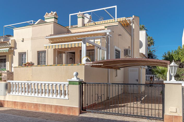 Excellent location for this spacious quad villa in the popular Residencial Jumilla complex in Playa Flamenca. The villa offers approx. 86 m² of living space over two floors, with three double bedrooms with fitted wardrobes, two bathrooms, a generous living and dining area, kitchen, sunny terrace, and storage room.