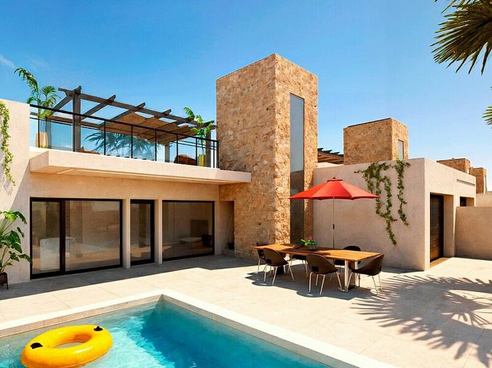 This contemporary, single-level detached villa features 3 bedrooms, 3 bathrooms, and sits on a generous 300m2 plot. A standout feature is the expansive 105m2 solarium, ideal for year-round sunbathing and outdoor entertainment. The property also includes a private garage and private swimming pool, and the development offers an additional communal pool for all residents.