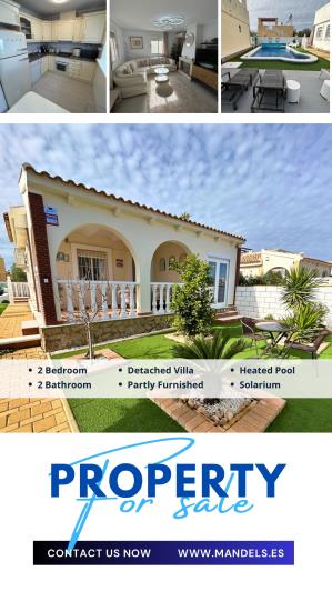 The beautiful 8 x 4 heated pool with summer cover, outdoor shower, seating area and bar are situated to the left of the villa. There is a fenced off area and 2 storage cupboards at the rear of the property.