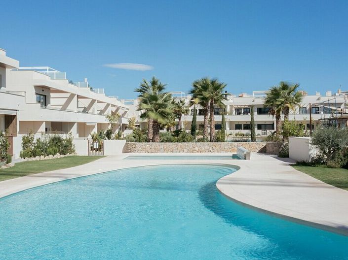 Exclusive Beach Location complex offers 56 premium apartments with a leisure pool, gymnasium, picnic area, and a large 4300 m2 central garden extending to private terraces. Communal areas feature Mediterranean landscaping and a large pool. The gardens use indigenous plants and palm trees for sustainability. Residents benefit from outdoor fitness equipment and underground parking. Located 250 meters from La Veleta Beach between Torrevieja and Orihuela Costa, it provides easy access to golf, tennis, padel, watersports, shops, restaurants, and daily services within walking distance.