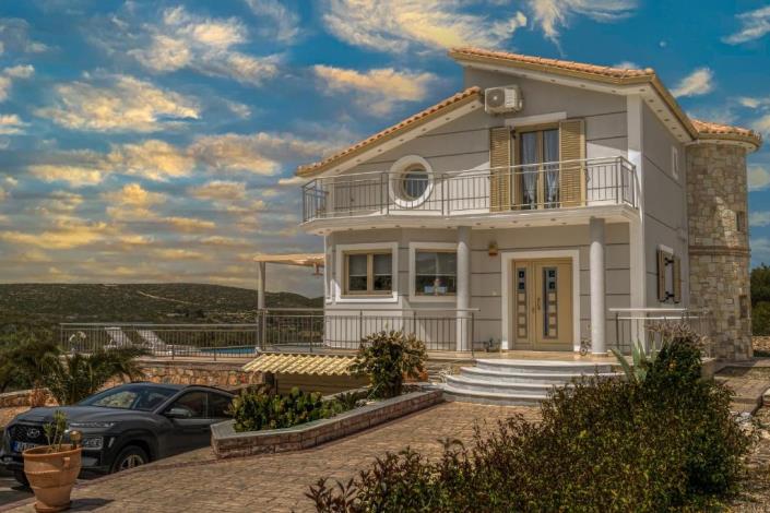 The property includes a private pool, garage, built-in barbecue, garden, and balconies totaling 40 sq.m. It has direct access from an asphalt road, and its position provides unobstructed panoramic views. The interior features a living room, kitchen, three bedrooms, two bathrooms, and an internal staircase connecting all levels, while the basement can serve as a garage and storage area.