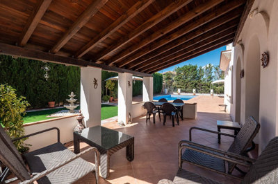 Outside, at the rear, there is a kitchen area, a large 5 x 3 meter built pergola with a tiled roof, a garden area with artificial grass, a fountain and 2 more pergolas next to the pool. The pool measures 5 meters by 9.8 meters up to the steps that take up 1.8 meters more. To the side is another terrace with planted borders, an orange tree, a lemon tree and a utility room with sink, washing machine, WC and shower. Steps take you to the lower level and driveway, where there are more planted areas, including 2 avocado trees.