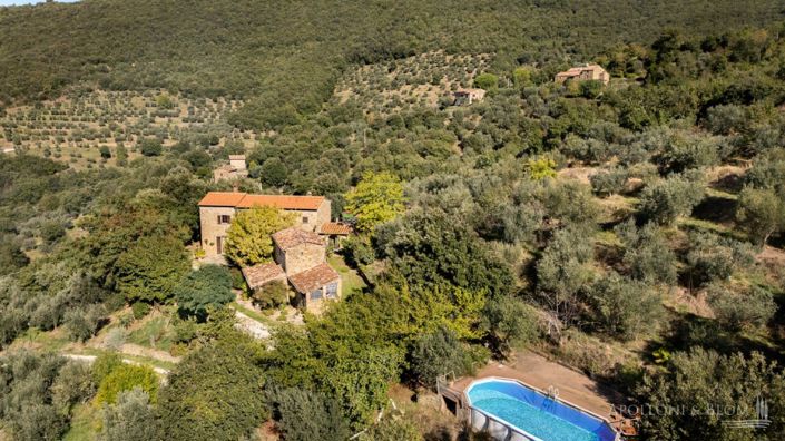 Characteristic 1800s stone country house renovated with pool, cottage, garden and olive grove for sale with amazing views of Cortona, Arezzo. A short gravel road leads to an enchanting hilltop position with woods, unspoiled nature, and endless views over the Valdichiana and the town of Cortona. This former farmhouse, dating back to the 19th century, has been completely renovated preserving its typical Tuscan style, featuring stone facades and interiors with exposed wooden beams and terracotta floors throughout. Some 165 square meters over two floors offer a large double living room with fireplace and an open plan kitchen on the ground floor and two bedrooms on the upper floor. The bathrooms have ceramic tiles and bath tube. The former hut has been partially renovated into a guest cottage with a living room, a bedroom, and the possibility to create a second bedroom. Surrounded by approximately 5 acres of private land, the property includes a landscaped garden, an above-ground oval swimming pool with stunning panoramic views, and an olive grove with 488 trees. An artesian well provides water for domestic use and irrigation. Private location only a few minutes from all amenities, ready to live in, perfect as a private all-year-round residence or for vacations, ideal for short-term rentals to host tourists for their stays in Tuscany.