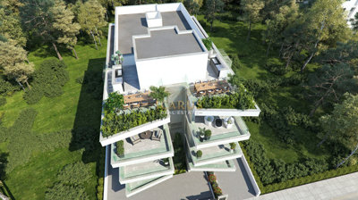 Situated on the top floor of a modern building, the apartment features contemporary architecture and high-quality materials throughout. The interior boasts an open-plan layout comprising a stylish kitchen, dining area, and comfortable living space, creating a bright and welcoming environment.