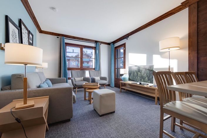 Located in the Manoir Savoie residence, in the heart of the Arc 1950 village, this two-bedroom apartment under a commercial lease enjoys a prime location within the resort.