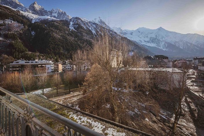 Its south-facing aspect provides exceptional views of the Mont Blanc massif, flooding the entire apartment with natural light.