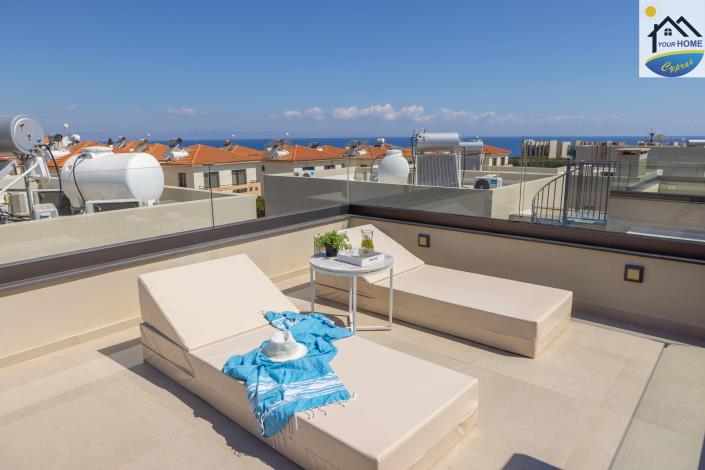 Upstairs, three generously proportioned bedrooms provide ample comfort and privacy, each finished with meticulous attention to detail. The master suite and additional bedrooms are complemented by modern bathrooms, ensuring both style and functionality. From this level, sweeping panoramic views of the sparkling sea unfold, while a rooftop garden offers a serene retreat to enjoy sunsets or quiet moments above the landscape.