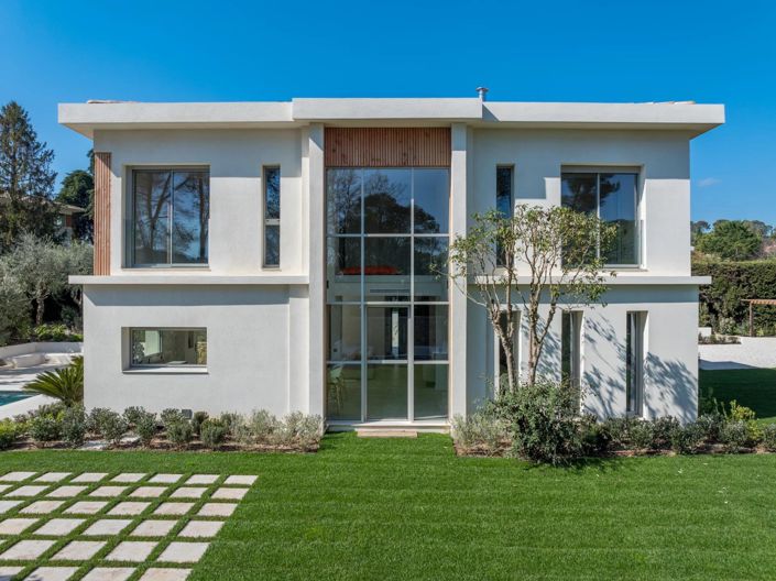 Located in a gated, secure estate close to international schools and the Cannes golf course, this villa features a contemporary design that blends seamlessly into the natural environment.