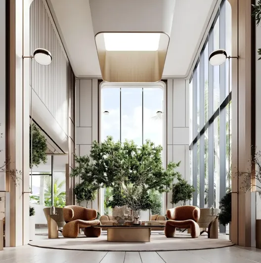 The interiors feature stone and travertine flooring, textured wall panels and soft wood elements, German appliances in the kitchens are combined with elegant golden accents in the bathrooms and spacious walk-in closets.