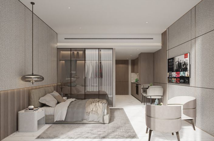 The project offers studios and one-bedroom apartments, designed with close attention to detail and high-quality standards. Interiors are finished in warm tones, featuring spacious bathrooms, hidden storage, soft lighting, and rain showers — all contributing to a sense of comfort and coziness.