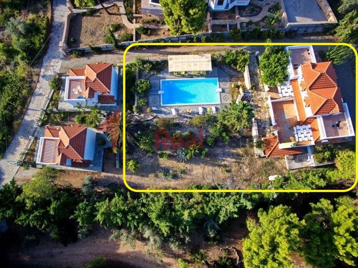 It is a south-west oriented, frontage and bright building. It was built in 2000 and is in extremely good condition. It consists of two (2) two level villas with a separate entrance. On the ground floor of 46,13 sq.m., we find a living room, a kitchen, a bedroom and a bathroom. An internal staircase leads us to the attic of 46,13 sq.m., where we find a single space with a bedroom. Their floor is made of tiles and laminate and the frames are wooden, they have a boiler and two air-conditions, each. They have double glazing, screens, storage, BBQ and a pool of 17.37sq.m. The residence is southwest-facing and has big terraces with an amazing view of the blue-green waters of the island. Outside, the property is surrounded by a green garden, ideal for hosting pets. It can also function comfortably as a hotel or short-term / long-term room rental business. Access via paved road, while it also has a space for parking. It is close to the port, the beach, restaurants, the local market and supermarkets in the area.