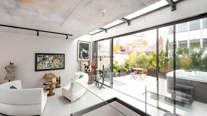 Parc Montsouris. At the end of a private cul-de-sac, very close to the park, this two-story house comprises, on the ground floor, a first reception room of nearly 60 sq m with 4.80 m high ceilings, a small kitchen, and a mezzanine. On the first floor, there is a living room with an open-plan kitchen, three bedrooms, one with a large bay window and loggia (offering the possibility of independence), two shower rooms, and two toilets. On the second floor, a large, bright, air-conditioned open-plan living area opens onto a 37 sq m terrace with trees. Agency fees payable by the seller. Information on the risks to which this property is exposed is available on the Géorisques website: