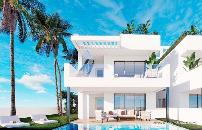 Modern residential complex in Finestrat, a few minutes’ drive from Benidorm and its fabulous white sand beaches. An ideal location, surrounded by a wonderful natural environment, near the exclusive Villaitana Golf course, amusement parks, and 10 minutes from the "La Marina" Shopping Centre, which has a wide range of shops, bars and restaurants. The A-7 and the AP-7 motorways make it quick and easy to reach the main cities of the province, such as Villajoyosa, Altea, Calpe and Moraira. And Alicante International Airport is only 40 minutes away. An ideal location for those looking for a holiday home or to live all year ‘round.The project comprises terraced villas with 3 bedrooms, either on one or two floors; as well as apartments with 3 bedrooms, either with a private garden or a private solarium. All models present an open design, combining the kitchen, dining area and lounge, with large windows opening onto the terrace. The master bedrooms have a private bathroom and, depending on the model, also direct access to the pool area. Thanks to the natural elevation of the land, the beautiful views of the Benidorm skyline, and the Mediterranean, can be enjoyed from the garden and the solarium.