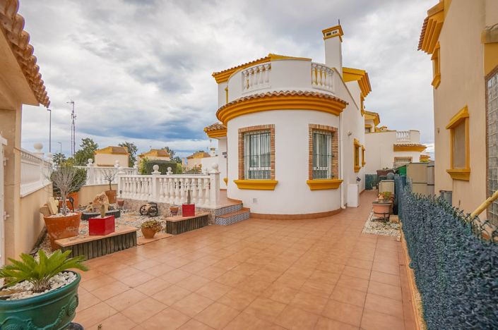 We are delighted to present this immaculate three-bedroom, two-bathroom detached villa, offering exceptional quality and comfort throughout. Situated on a peaceful corner plot within a small and well-maintained residential community of similar-style homes, this charming property enjoys a tranquil setting while benefiting from access to a nearby communal swimming pool, ideal for relaxing and socialising. The villa boasts a prime location, just a seven-minute walk from a wide range of amenities, including bars, restaurants, a supermarket, and everyday essentials, making it perfectly suited for both permanent living and holiday use. The property offers a constructed area of approximately 101 m² and sits on a secure, fully tiled plot of around 200 m², designed for low-maintenance outdoor living.