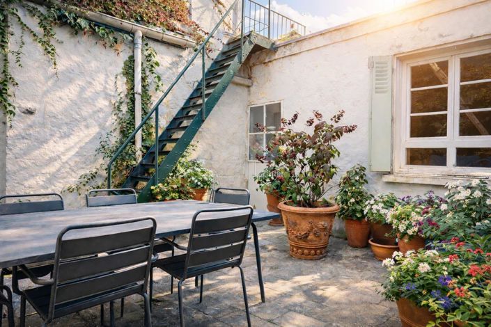 On the ground floor: a beautiful entrance hall, living room, dining room with fireplace, kitchen opening onto a private courtyard, bedroom, dressing room, bathroom, laundry room, and toilet.
