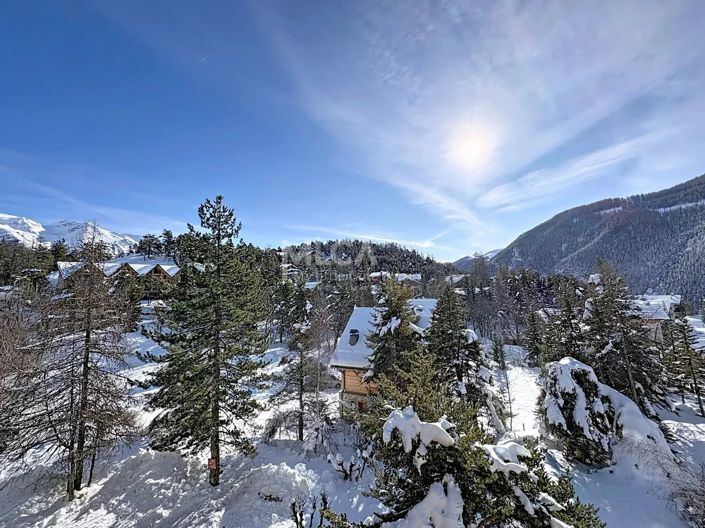 On the first level, an entrance hall with a large closet leads to a shower room with a window overlooking the Col de la Bonnette mountain pass, a separate Wc, and an open-plan fitted kitchen/living room with a wood-burning stove and access to a south-facing terrace offering panoramic views of the surrounding peaks.