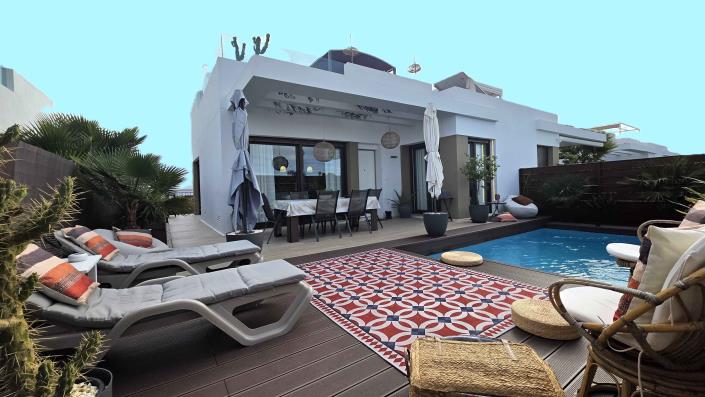 This south-west facing bungalow-style villa in Vistabella Golf, built in 2023, is designed for comfortable, modern living all on one level. The property offers three bedrooms and two bathrooms, including a master bedroom with bathroom en suite. Its special open-plan layout features a contemporary American-style kitchen with a central island, while large windows throughout the home create a very bright and luminous atmosphere. Comfort is ensured year-round with ducted air conditioning for heating and cooling in all rooms, and 19 photovoltaic panels provide ample electricity supply and excellent energy efficiency. The villa is sold fully furnished with stylish furniture and decorated like a showhouse, ready to move in.