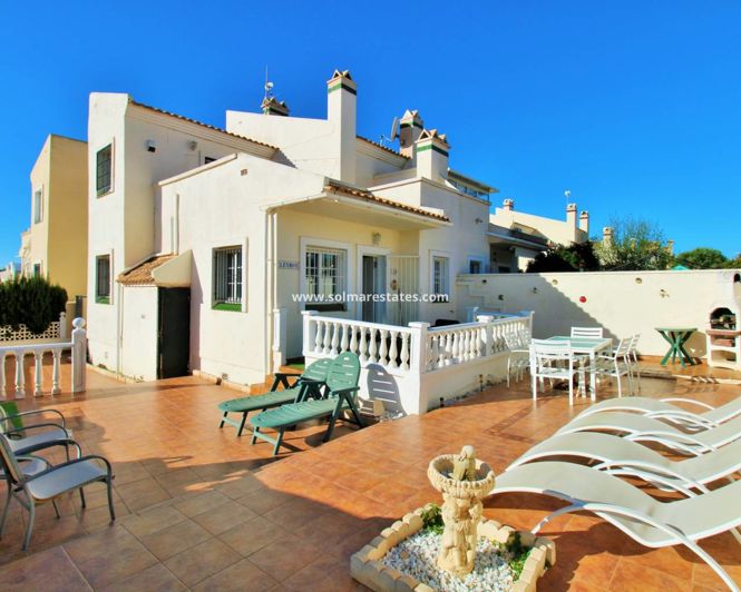 Occupying a generous corner position, the property boasts extensive wraparound outdoor areas, perfect for entertaining, al fresco dining, sunbathing, or simply embracing the Mediterranean lifestyle. The substantial plot also allows for secure off-road parking within the boundary — a highly valuable feature in this prime location.