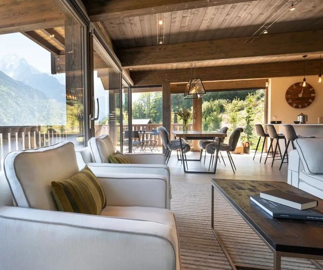 This contemporary 5-bedroom chalet is situated in an exceptional setting, within a secluded hamlet of five wooden chalets, offering ski-in/ski-out access to the 'La Saint-Gervais' slope and direct access to the Évasion Mont-Blanc ski area. Boasting unobstructed views of the Mont Blanc massif, this three-story chalet, with a total surface area of approximately 205 sqm (189 sqm of living space), impresses with its generous proportions, high-quality materials, and post-and-beam construction by a renowned local builder. It comprises six bedrooms, two bathrooms, three shower rooms, a spacious living area opening onto a sheltered terrace and garden, as well as a sauna, a ski room, and a large, enclosed, motorized garage with direct access to the chalet.