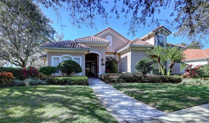 Your search is over with this exceptional custom lakefront estate located in the highly sought-after Reserve at Heathrow. Perfectly positioned on scenic Lake Irish, this impressive home offers breathtaking sunset views and an expansive open floor plan designed for both everyday living and unforgettable entertaining. Featuring five spacious bedrooms plus a private office, four full baths, a dedicated theatre room, and a large bonus room complete with a custom built-in bar and screened balcony, there is truly no shortage of space. The heart of the home is the oversized gourmet kitchen, showcasing custom cabinetry, granite countertops, a tiled backsplash, built-in stainless steel appliances, a breakfast bar, and a generous walk-in pantry, all seamlessly flowing into the main living areas and outdoor spaces. The luxurious primary suite is a true retreat with an oversized walk-in closet, dual vanities, a corner jetted tub, and a separate walk-in shower. Additional upgrades include soaring 12-foot ceilings with crown molding, decorative tray ceilings, custom architectural details throughout, and built-in cabinetry in the family room. Residents of Heathrow enjoy premier amenities such as two 24/7 manned guard gates, Sawyer Lake Park with playground, ball fields, basketball courts, soccer fields, and a clubhouse available for private events. This remarkable lakefront home offers luxury, space, and an unbeatable lifestyle—schedule your private showing today.