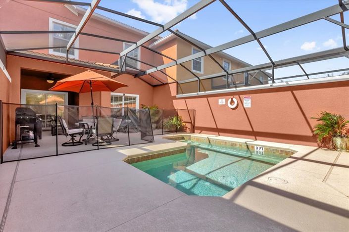 Beautiful 4-bedroom, 3-bath townhome with a private heated splash pool, located in Paradise Palms—one of the Disney area’s most desirable and high-demand vacation rental communities. This spacious property offers nearly 2,000 square feet of living space and features ceramic tile, granite countertops, stainless steel appliances, and a screened lanai with no rear neighbors for added privacy. The home is fully furnished and currently in a successful vacation rental program with future reservations already in place that will transfer to the new owner, providing immediate income. Bedding has been optimized for maximum rental potential, making this a turnkey investment opportunity. Paradise Palms offers resort-style living with a stunning lagoon-style pool featuring a waterfall, slide, covered grotto and two spas, along with a licensed Tiki Bar and Grill. The expansive clubhouse includes a concierge desk, spacious lounge, complimentary internet café, 50-seat movie theater, sundry shop, deli, card room, meeting spaces, sauna, a fitness center overlooking the pool, and a full arcade and game room with billiards tables. Outdoor recreation includes basketball and volleyball courts, two lighted tennis courts, a playground, and picnic and BBQ areas. The community is gated and secured 24/7. The HOA covers cable, phone, high-speed internet, trash valet, 24/7 security guard, landscaping, common grounds maintenance, and insurance, offering a low-maintenance ownership experience. Ideally located just south of US-192 and only minutes from Disney World, Universal Studios, SeaWorld, Discovery Cove, and premier shopping and dining, this property is an outstanding choice for investors seeking a strong-performing vacation rental in a prime location.