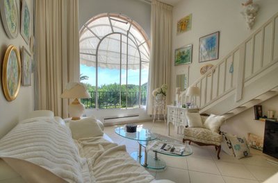 A unique location, within a historic bourgeois residence steeped in history, nestled in the heart of a sumptuous landscaped park boasting a majestic swimming pool. This haven of peace is home to this magnificent, charming apartment of 74.80 sqm. It combines the charm and elegance of period features with tranquility and a high quality of life, just steps from golf courses and 5 minutes from the sea. The apartment comprises a beautiful entrance hall with ample storage, a shower room, a separate toilet, a functional kitchen, and a spacious living/dining room opening onto a splendid glass-roofed window that floods the apartment with light and offers undeniable charm, as well as an unobstructed view of the park and its Mediterranean vegetation. A large 12 sqm mezzanine has been converted into a comfortable bedroom with air conditioning and provides access to a large attic offering valuable storage space. Parking is available within the secure residence, and a bicycle garage is also provided. A true haven of peace in the heart of the French Riviera, an absolute must-see.