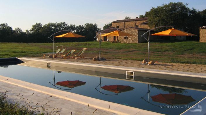 Classic renovated stone farmhouse with swimming pool, solar panels, and land with DOC vineyards for sale in Civitella Paganico, Grosseto. In the unspoilt heart of the Tuscan Maremma, near Civitella Paganico and within easy reach of both the Tyrrhenian coast and the celebrated vineyards of Montalcino, this distinguished 1700-century estate extends across 67 hectares of private land, offering a rare synthesis of heritage, sustainability and productive excellence. The villa, dating from the 1700s and meticulously restored in 2006, provides 750 square meters of accommodation arranged as five self-contained apartments, currently operating as refined holiday residences yet equally suited to an elegant private home. Exposed stone façades, terracotta floors, brick arches and beamed ceilings honour the building’s agricultural origins, while generous open-plan living spaces include wooden fireplaces and panoramic outdoors overlooking the swimming pool and the rolling countryside beyond. Across eight en suite bedrooms, some with private Jacuzzi and terraces, the interiors balance authenticity and comfort, including a characterful period-style kitchen preserved as a tribute to the house’s heritage. Modern systems have been seamlessly integrated, with photovoltaic panels, solar energy, underfloor heating and rainwater collection ensuring efficiency and environmental responsibility without compromising charm. Beyond the main residence, a 40 sq m annex serves as laundry and technical space, while a 120 sq m agricultural barn supports the storage of equipment and stock. The land features 4 hectares of Montecucco DOC vineyards, an olive groves with 1,000 trees, extensive arable fields, pasture and woodland, creating both privacy and tangible agricultural income. Moments from the natural reserves and the Farma and Ombrone rivers, and close to the thermal waters of Terme di Petriolo, the property enjoys a discreet yet strategic position, just 5 km (3 miles) from shop and amenities. A compelling holding in one of southern Tuscany’s most authentic landscapes. PROPERTY Ref: GRO3564Location: Civitella Paganico, Province: Grosseto, Region: TuscanyType: 750 sq m/8073 sq ft two-story former farmhouse finely restored with swimming pool, solar energy, 2 annexes and 67 ha/165.5 acres of agricultural land including Montecucco DOC vineyards and olive grovesYear of construction: 1700Year of restoration: 2006Conditions: excellentLand: 67 ha/165.5 acres including 4 ha/9.8 acres Montecucco DOC vineyard; 3.2 ha/7.9 acres olive grove with 1000 trees; 31 ha/76.6 acres arable land; 23 ha/56.8 acres forest, 5 ha/12.3 acres pasture landSwimming pool: 16x5 m, max depth 2.1mLayout: