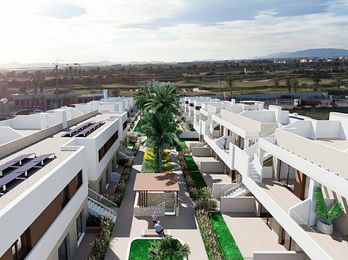 Located just metres from the prestigious Serena Golf course and only minutes from the Mar Menor beaches and La Concha beach in Los Alcazares, this exclusive development offers a diverse range of properties. Ground-floor bungalows feature private gardens of up to 122 m2, while top-floor units offer spacious terraces and private solariums with various customisation options. The development also includes three types of detached villas, available in one or two storey layouts, with generous plots ranging from 201 to 356 m2.