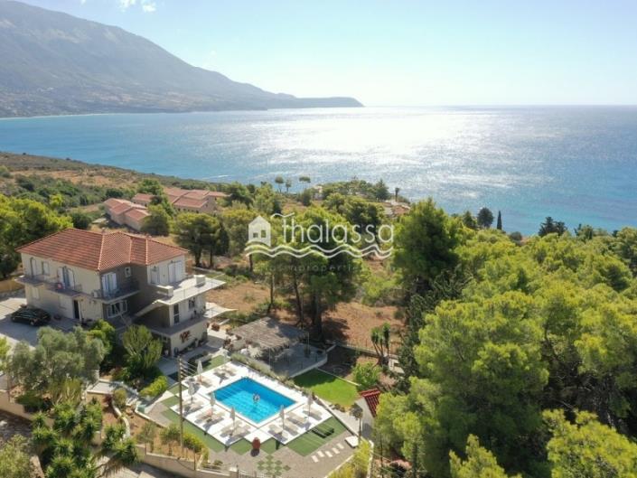 An impressive villa with a total area of 331.90 sq.m. is available for sale in the picturesque village of Pessada, Kefalonia, known for its serene beauty and the port that connects it with Zakynthos. The residence is built on a privileged plot of 2,265.30 sq.m. and is located just 400 meters from the beach, offering stunning and unobstructed views of the endless blue of the Ionian Sea. The villa is designed to function as a flexible investment, consisting of seven (7) independent units: six (6) self-contained one-bedroom apartments, each with its own bathroom and kitchenette, and one (1) spacious main apartment with three (3) bedrooms, two (2) bathrooms, a large, fully equipped kitchen, and a fireplace. All areas are characterized by their brightness and functionality, ensuring privacy, making the property ideal for either extensive private use (accommodating many guests) or immediate tourist exploitation (unit rentals). The outdoor areas form an oasis of relaxation and entertainment, including a private swimming pool within a beautifully landscaped garden, large covered verandas offering exceptional views, a courtyard with barbecue (BBQ) facilities for outdoor gatherings, and private parking space. This property boasts excellent return prospects, suitable both as a permanent or holiday residence and as a successful investment in the tourism sector of Southern Kefalonia, in a quiet yet privileged location. Pessada is a charming seaside village that offers captivating views towards Zakynthos and Mount Ainos, features a mini market, and in addition to the main beach, the beautiful Ammos and Vrysi beaches are located nearby.