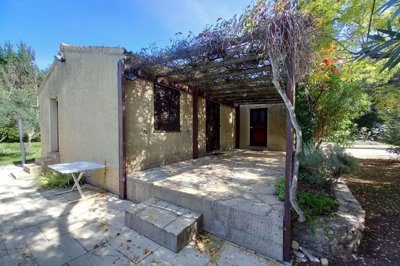 Uzès 7 km: In a dynamic village with school and shops: 1980s villa in a bucolic, wooded setting with no opposite views, about 85 m² including spacious bright living room, separate kitchen, utility room, 2 bedrooms, shower room, toilet. Garage. 10x5 m pool. 1500 m² plot divisible. Renovation work needed but great potential as extension of about 150 m² is still possible.