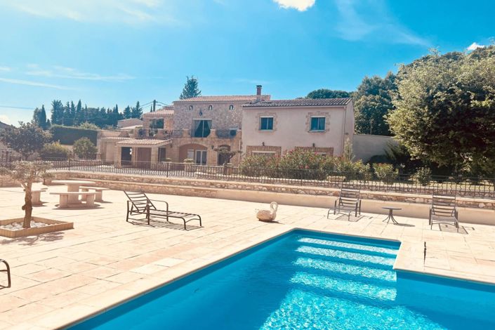 4 km from all amenities, a solid masonry house of about 248 m2, mostly doubled in stones, offering: entrance, laundry, toilets, large living room with dining and kitchen area, independent equipped kitchen with access to partially covered terraces. Night area comprises 3 bedrooms with wardrobes and 1 with en-suite shower room, bathroom with toilets. On the ground floor: summer kitchen, access to an independent apartment with a beautiful living room/dining area, equipped kitchen, 3 bedrooms, shower room and toilets. Pool 10.5 x 5 m with 300 m2 deck and covered pool house. Large wooded and fenced garden with no vis-à-vis of about 7800 m2, motorized garage for a car, air conditioning! Beautiful amenities in a superb environment at the entrance to Uzès.