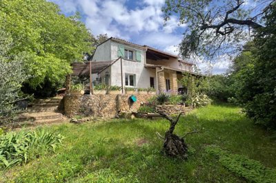 Exclusive - Uzes 7 km, pretty house from the 1980s offering about 132 m² on a 1,523 m² fenced and treed plot, no vis-à-vis with pool (2016). Composed of a large living room with stove, access to south/west terrace, open-plan kitchen with dining area, bedroom and bathroom + separate toilet. Upstairs: 3 bedrooms + bathroom and toilet, south-facing terrace of about 23 m². Laundry room and garage with mezzanine. Ideal family home, beautiful quiet environment, dead-end street.