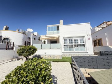 Beautifully presented three-bedroom, two-bathroom detached villa located in the highly sought-after area of Los Dolses on the stunning Orihuela Costa. Finished to an exceptional show home standard, this impressive villa offers bright, spacious, and versatile living throughout. The welcoming lounge area seamlessly connects to the third bedroom, currently utilised as an elegant dining space, providing flexibility to suit your lifestyle. The separate modern kitchen is both stylish and practical, fully equipped with a double oven, integrated microwave, and a built-in coffee machine station — perfect for contemporary living and entertaining. The ground floor also features a generously sized guest bedroom with fitted wardrobes and a beautifully presented modern family bathroom finished to a high specification. Upstairs, the impressive master suite offers a sleek en-suite bathroom, a sun room with folding glass curtains, and a walk-in wardrobe. From here, you step out onto a large south-facing sun terrace complete with dedicated sun lounging space and a private Jacuzzi area — an ideal setting for relaxing or entertaining while enjoying the Mediterranean climate. Set on an elevated plot, the property benefits from covered off-road parking with a carport (with electric gates) and offers the option to install a private swimming pool, if desired. The spacious rear garden provides additional outdoor enjoyment, including a storage shed and a shaded seating area. This superb villa is offered part furnished to an excellent standard and further benefits from mains gas central heating, full air conditioning throughout, electric shutters on the upper level, and electric toldos for additional comfort and convenience. An idyllic small community of 22 villas that share a lovely, quiet communal pool area. An exceptional opportunity to acquire a stylish, move-in-ready home in a prime coastal location.