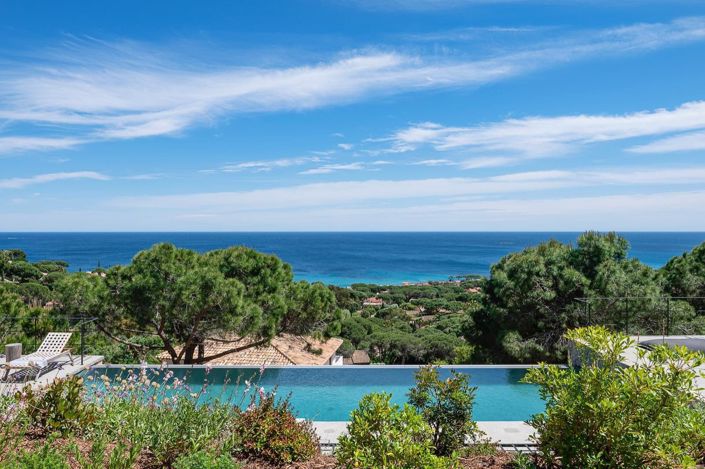 Sale of villa in Sainte-Maxime. In the sought-after area of La Nartelle, stunning renovated villa offering a magnificent panoramic sea view.The property includes: entrance hall, cloakroom and guest Wc, spacious living room with fireplace opening onto large terraces, fully equipped open-plan kitchen, pantry, and five bedrooms each with a private shower room.Laundry room and office.Independent two-room apartment.Large garage.A heated pool and its pool house enhance the beautifully landscaped garden.