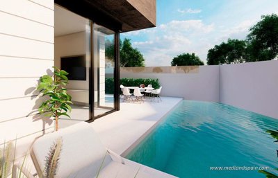 Set within a quiet, up-and-coming residential area, these homes in Pilar de la Horadada form an exclusive project of just two contemporary residences designed for relaxed Mediterranean living. The setting combines a calm neighbourhood atmosphere with easy access to everyday amenities, making it well suited both for permanent living and for extended stays on the southern Costa Blanca. Shops, cafés, restaurants, sports facilities and local services are all close at hand, while the town centre and surrounding coastal areas are easily reached.Each home is arranged with 2 bedrooms and 2 bathrooms, offering a well-balanced layout that prioritises natural light, comfort and a smooth connection between indoor and outdoor spaces. The ground-floor model is built on a spacious plot and features a landscaped Mediterranean-style garden with non-slip tiling around the pool area, creating a pleasant environment for everyday relaxation. The top-floor model enjoys an elevated position and includes a generous solarium with a pergola-covered dining area, extending the living space outdoors and providing an inviting setting to enjoy the mild climate throughout the year. Both homes include electric blinds, pre-installation for air conditioning, white goods in the kitchen and parking on the premises. Optional upgrades are available at extra cost, including an integrated microwave and dishwasher and underfloor heating in the bathrooms, allowing owners to personalise the home to their preferences.The surrounding area of Pilar de la Horadada is known for its active lifestyle and strong local community. A wide range of sports facilities and activities are available nearby, from fitness centres and cycling routes to water sports along the coast. The beaches of Torre de la Horadada are approximately 2.5 km away, making spontaneous trips to the sea easy and appealing, whether by car, on foot or by bicycle. Several well-regarded golf courses are also located within a short drive, adding further leisure options to the area.Connectivity is another strong point. Alicante–Elche Airport is typically reached in about 45 minutes by car, while Murcia–Corvera Airport is around 35 minutes’ drive. With its combination of thoughtful design, practical features and a well-connected location, this small-scale project offers an appealing lifestyle opportunity on the southern Costa Blanca.