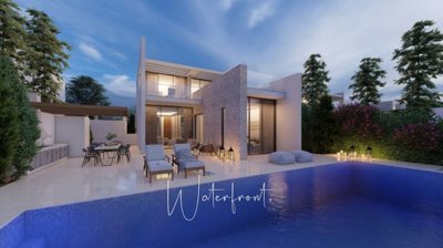 Nestled on a scenic hillside in the St. George area, the Panoramic Villas project boasts a breathtaking location with sweeping views of one of Cyprus’s most unspoiled coastal regions. This exclusive development features nine two-story independent villas, each with three bedrooms and a private pool, just a short 5-minute walk from the nearest beach. Designed to complement its stunning surroundings, the project blends contemporary aesthetics with functionality. The villas are thoughtfully crafted to maximize the panoramic sea views, with generous glazing that floods the interiors with natural light. The ground floor offers an open-concept living area with floor-to-ceiling windows, a modern, fully equipped kitchen, and a stylish dining space. Upstairs and downstairs, the three spacious bedrooms, each with en-suite bathrooms, provide privacy and comfort, with the master bedroom featuring an en-suite dressing room and walk-in closet for an added touch of luxury. The outdoor spaces are equally impressive, with expansive plots ensuring privacy and tranquillity. Each villa includes a large pool surrounded by sun loungers, seating, and dining areas, perfect for enjoying the serene atmosphere day or night. Located near the prestigious Cap St. Georges Hotel & Resort, Cyprus’s largest and most exclusive seafront resort, Panoramic Villas offers an unparalleled combination of luxury, privacy, and proximity to nature.