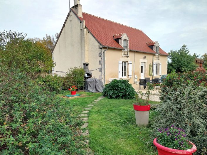 Nabij Le Blanc: huis in goede staat, rustig gelegen aan het einde van een doodlopende weg. Het heeft een keuken, eetkamer, woonkamer en 3 slaapkamers, waarvan een beneden. Boven is ook een bureau/slaapkamer en een strijkruimte. Groot bijgebouw, verdeeld in zomerkeuken, grote ruimte met bar, douche/WC, bergingen en een carport. Groot terrein met boomgaard en moestuin, mooie binnenplaats met toegangspoort en groot terras op het zuiden. Pluspunt: een gebouwtje waarin een boorput voor water!