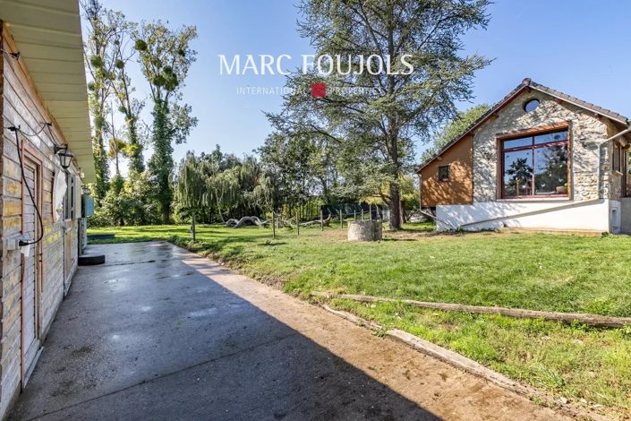 The 5,000 m² ground includes five horse stables, a 40 x 20 m Fontainebleau sand arena, and a tack room. Ideal for animal breeding or a small private stable with direct access to the forest.