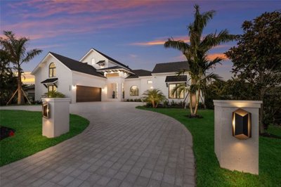 One-Of-A-Kind, New Custom-Built residence on prestigious Bird Key, offering a rare combination of scale, elevation, and thoughtful design. Spanning over 4,900 square feet, this refined contemporary home blends modern architecture with Florida’s timeless coastal charm and is carefully planned to maximize privacy, comfort, and functionality. The home features four bedrooms, four-and-half bathrooms, a private office, and a separate guest suite/casita with its own bedroom and living area. A circular driveway leads to a striking double-height entry with oversized glass doors, opening to dramatic ceilings and light-filled interiors. The elegant great room, anchored by a fireplace, flows seamlessly through walls of glass to the covered poolside terrace with tray ceiling. Designed for both everyday living and entertaining, the gourmet kitchen offers a substantial island, high-end finishes, and a generous butler’s pantry. The dining area opens to both the terrace and a fully equipped summer kitchen. The first-floor owner’s suite is a retreat with direct terrace access and a spa-inspired bathroom. A private two-room casita provides ideal guest accommodations, while two additional en-suite spacious bedrooms are located upstairs. Additional highlights include an elevator servicing four levels, a mezzanine-level bonus room that can be used as a gym or media room, a well-appointed laundry room, and an impressive 33 x 15 ft enclosed pool and spa, creating a substantial extension to the home’s indoor living areas. Elevated 11 feet above sea level and positioned on a larger-than-typical lot, this residence stands apart for its unusually generous homesite, allowing for exceptional first-floor living and expansive outdoor spaces rarely found in new construction on Bird Key. Bird Key offers an exceptional location just minutes from downtown Sarasota, the shops and dining of St. Armands Circle, and the beaches of Lido Beach. The Bird Key Yacht Club is currently undergoing a full rebuild and is anticipated to reopen in 2026 as one of Sarasota’s premier destinations for boating, dining, tennis, and social events. Please note image of the gym (Bonus Room) has been digitally staged.