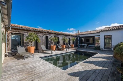 Sainte-Marie de Ré: Just steps away from the beach and shops, a 190 m2 single-story villa built in 2019. Separate kitchen, dining room and living room of 90 m2 with fireplace, 6 bedrooms, 6 shower rooms with toilets, each bedroom opens onto a patio, a terrace or a zen garden. Large terrace with a mobile bottom pool. Garage. Possibility to purchase furnished. A rare property, ideal for a primary or secondary residence.